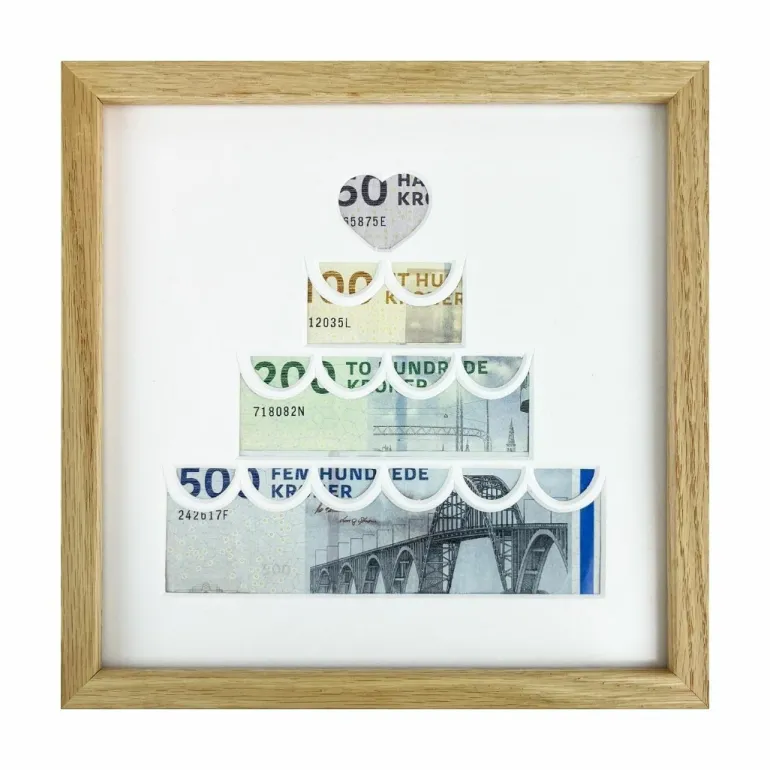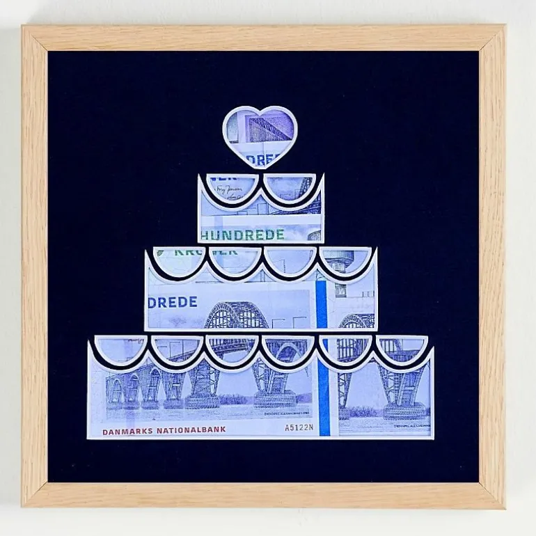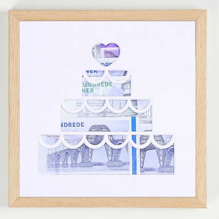 Giv en pengegaveramme i en bryllupskage udskåret passepartoutramme og send det helt rigtige budskab på en kreativ måde.