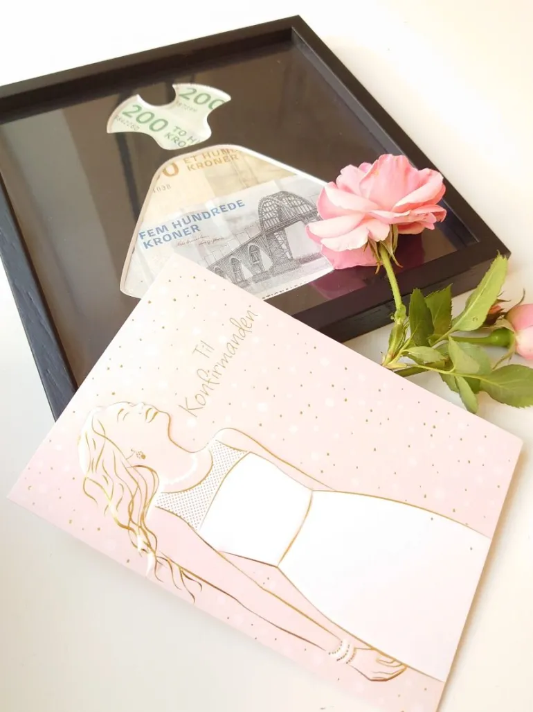 Pengegaverammen til konfirmandinden med den fine kjole. Sæt pengene bag kjolen i passepartoutet og skab en fin personlig pengegave
