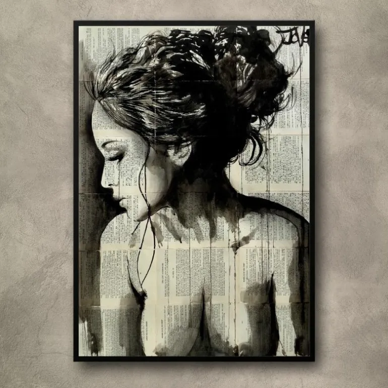 Plakattryk lavet på kunstbillede med tegning, kul og farvekridt på vintage bogpapir. Motivet er en del af en serie der har udviklet sig over de seneste 10 år. Fokus er på kvinder og deres følelser.