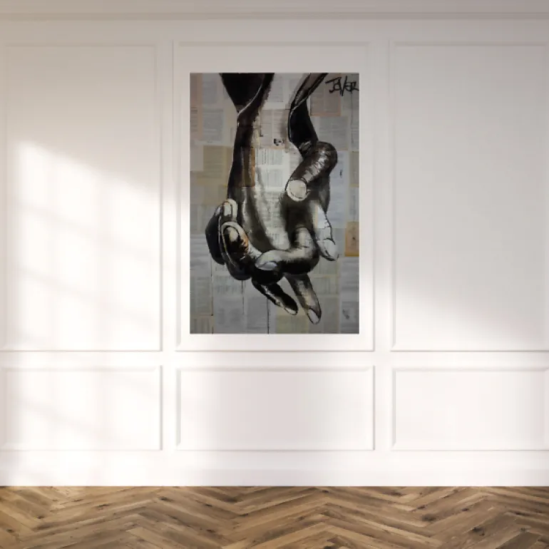 Plakattryk lavet på kunstbillede med tegning, kul og farvekridt på vintage bogpapir. Motivet er en del af en serie der har udviklet sig over de seneste 10 år. Fokus er på følelser.